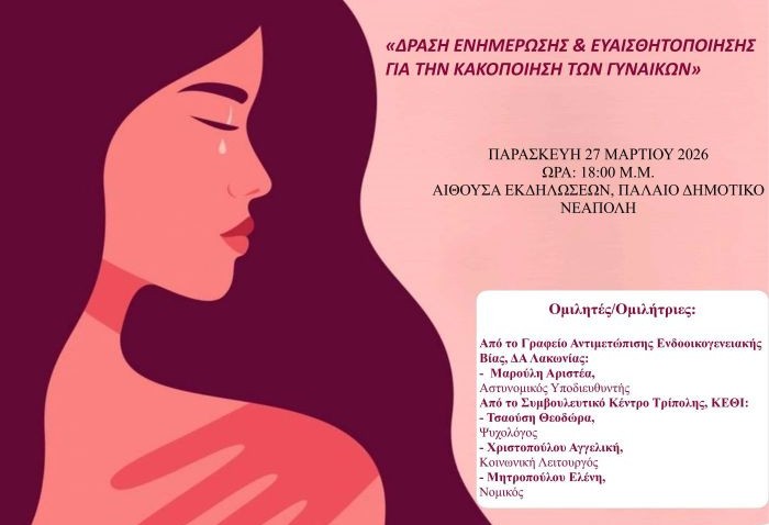 Η εκδήλωση θα πραγματοποιηθεί την Παρασκευή 27 Μαρτίου και ώρα 18:00 στην αίθουσα εκδηλώσεων του παλιού Δημοτικού Σχολείου Νεάπολης .